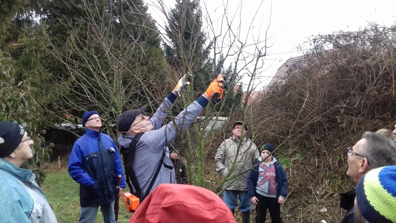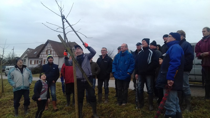 Le deuxième cours de taille de l'année avait lieu ce samedi 4 février à Aschbach. D'abord quelques hautes tiges ont été taillés sur une parcelle communale sur laquel la commune d'Aschbach à replanté différents fruitiers il y tout juste deux ans. Le groupe s'est ensuite dirigé vers le verger de la famille Leibold pour une taille d'entretien sur les différents arbres déja traités en 2016.